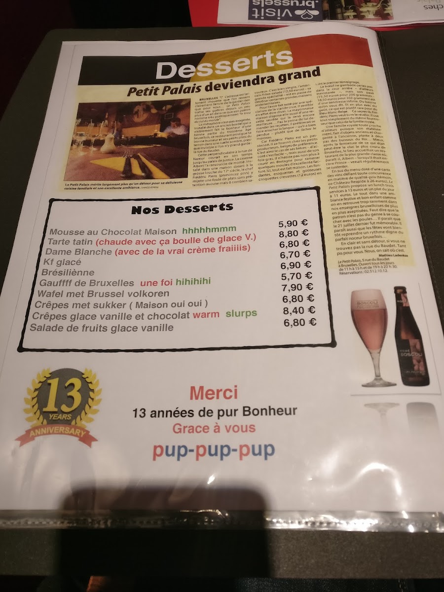 In conclusion, the menu at Le Petit Palais presents a refined yet approachable selection that reflects both classic European sensibilities and a touch of modern flair. The Beef Tartare stands out as a highlight, offering a fresh, delicately seasoned experience that showcases quality ingredients and careful preparation. Equally impressive is the Steak Sauce Poivre, which elevates the meat dishes with its rich, peppery depth, adding a satisfying balance of intensity and elegance. To complement the food, the inclusion of Lupus Beer provides a well-chosen beverage option, enhancing the overall dining experience with its distinctive character. Altogether, the menu demonstrates thoughtful curation, appealing to diners seeking both comfort and sophistication in a welcoming Brussels setting.